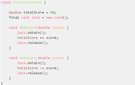 因此加分和减分这两个方法被并发的调用,它们共同操作总分数。为了保证数据的一致性,需要在每次操作前先获取锁,操作完成后再释放锁。