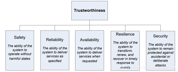 可信的英文:Trustworthiness。可信的软件是指:软件可按照预期运行,并且不会在环境改变时带来重大安全和隐私风险。按《Software Engineering》10th edition和其他相关标准的基本定义,可信包括5个基本维度,如下图: