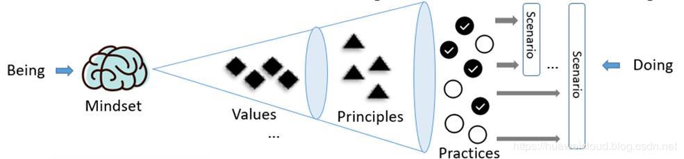 软件工程领域任何一个新事物,往往都是:思维理念开始——>形成基本的价值观(什么是对的,什么是需要避免的)——>形成一些基本原理——>形成一些有限的实践——>根据不同的场景,选择最适合的实践,形成一些最佳实践集合(比如敏捷实践中的Scrum,XP)。