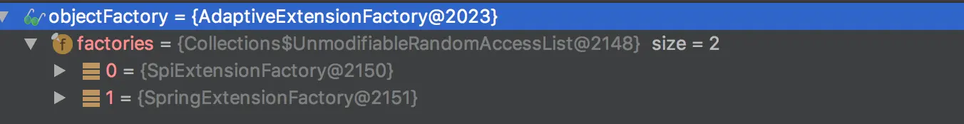 每个ExtensionLoader包含type,objectFactory两个元素。type是对应的接口,objectFactory就是定值。(AdaptiveExtensionFactory)