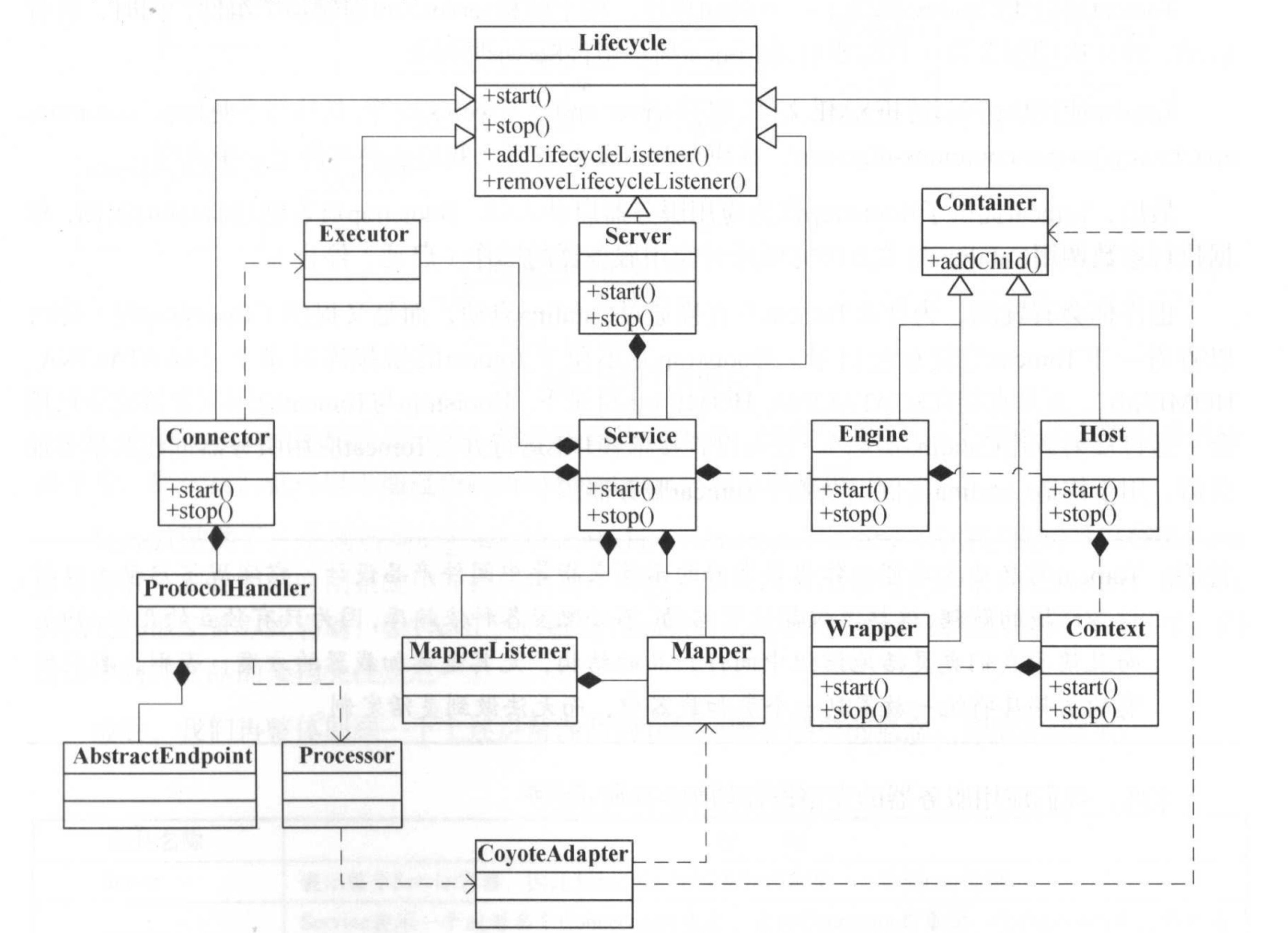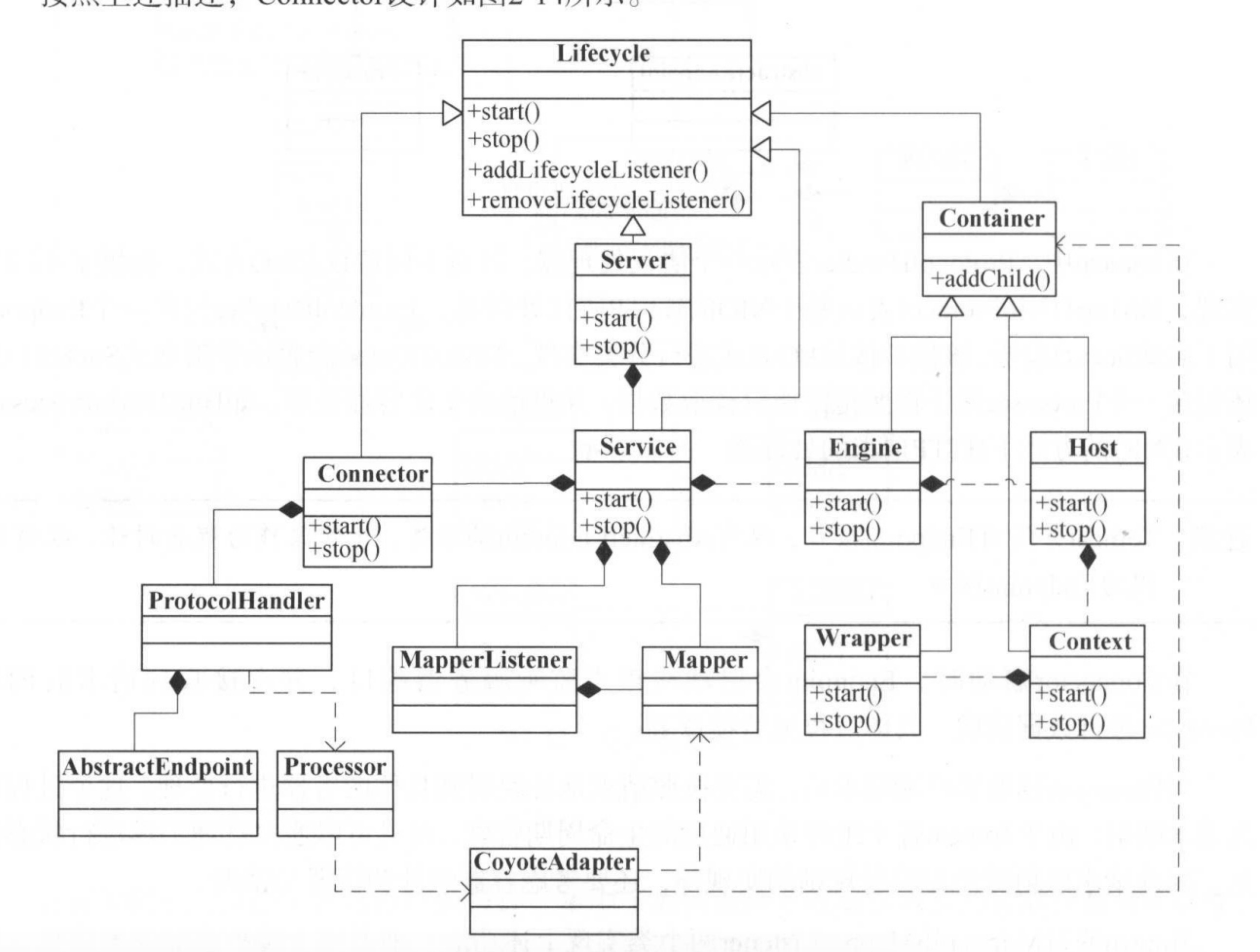 Connector与Container(Engine)如何关联起来呢?可以通过一个映射规则来解决这个问题,但这不够优雅。优雅的做法是通过Service把Connector和Container(Engine)关联起来,这样多个Connector的请求就能关联到该Service中的Engine处理。