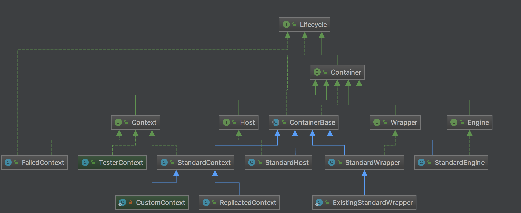 Container作为顶层接口,Engine、Host、Context、Wrapper都继承该接口。然后每个接口有自己的实现类。同时继承同一基础类。