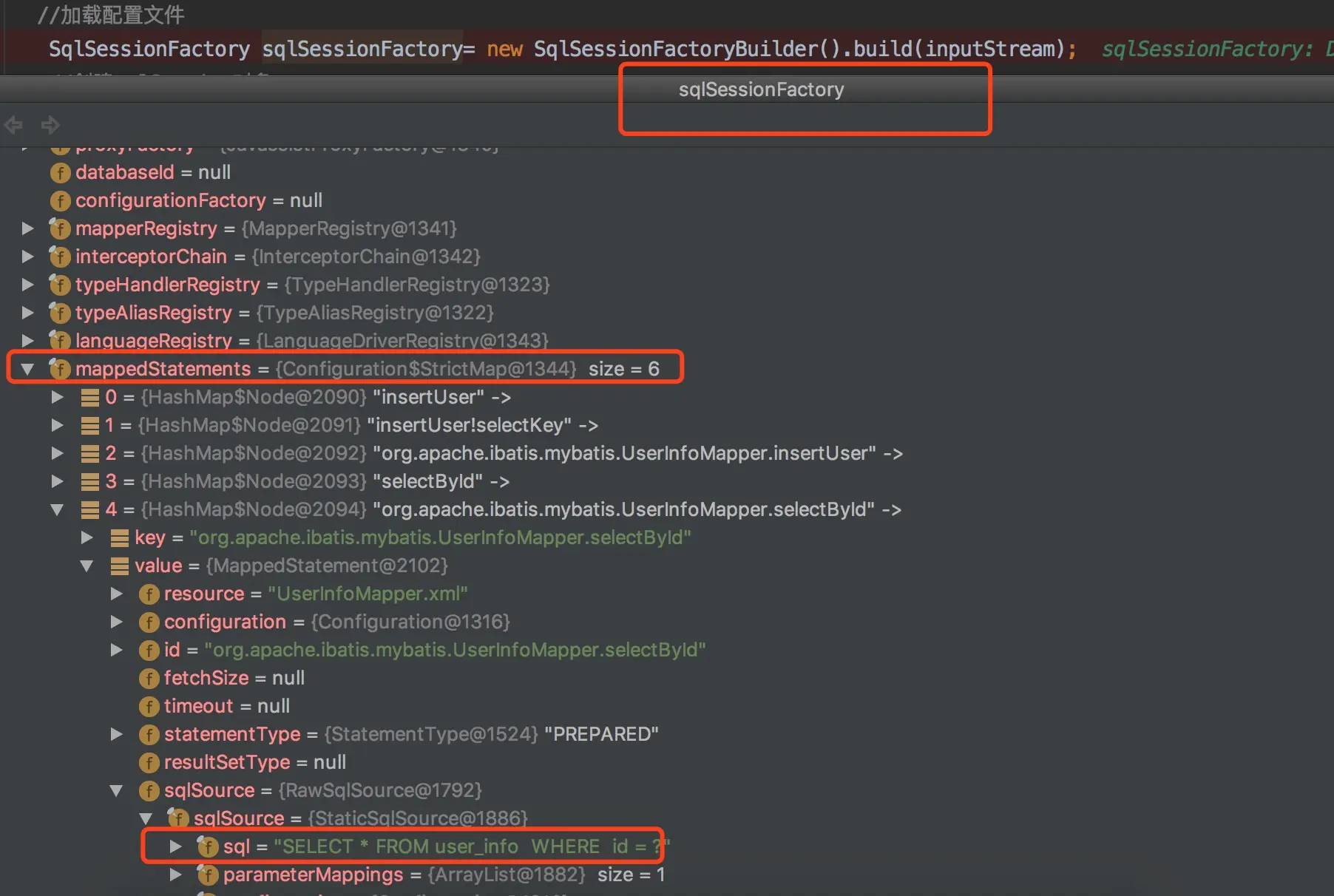 其实sqlSessionFactory中就已经准备好SQL了。我们看下截图
