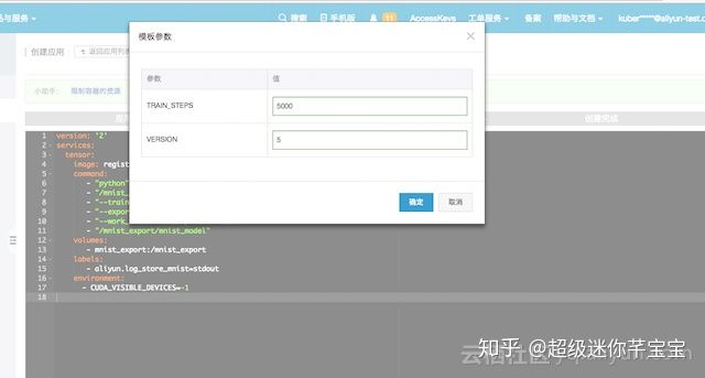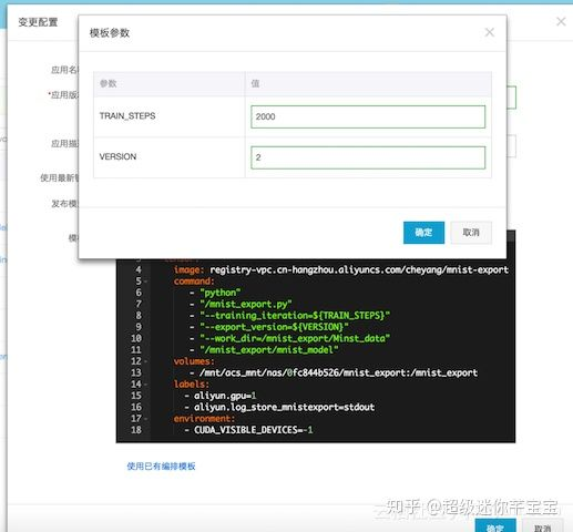 在阿里容器服务中创建应用时,就会弹出对话框,里面需要输入的是模型版本和训练参数,我们输入的模型版本为1和训练参数为100