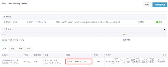 同时需要查看一下该服务的Endpoint,在这里TensorFlow Serving的Endpoint是10.24.2.11:9000。当然我们还可以将服务发布到SLB上,这在文章利用Docker和阿里云容器服务轻松搭建TensorFlow Serving集群中已经有了比较详细的描述,就不在本文中赘述了。