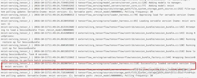 4. 可以在日志服务中直接查看一下TensorFlow Serving的日志,发现版本1的模型已经加载到了serving中了