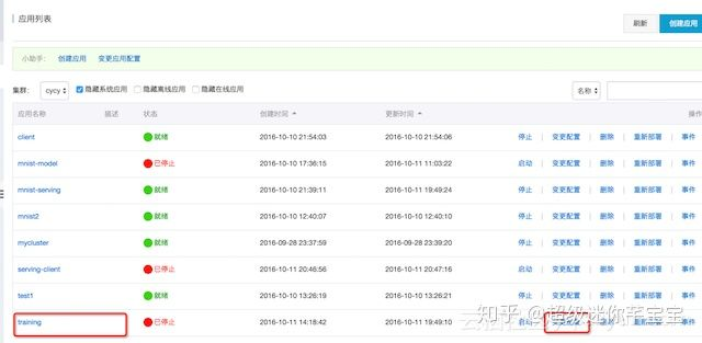 serving-client_tensor_1 | 2016-10-11T12:47:04.326549709Z E1011 12:47:04.326484533 69 chttp2_transport.c:1810] close_transport: {"created":"@1476190024.326451541","description":"FD shutdown","file":"src/core/lib/iomgr/ev_poll_posix.c","file_line":427}6. 为了提升识别效果,就需要调整参数重新运行一次TensorFlow Learning应用重新发起一次训练.可以直接在容器云服务的页面点击变更配置