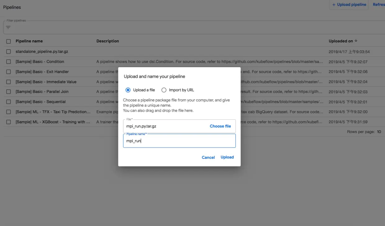 2.将该压缩包上传到Kubeflow Pipeline的web控制台,并且将名字改为mpi_run