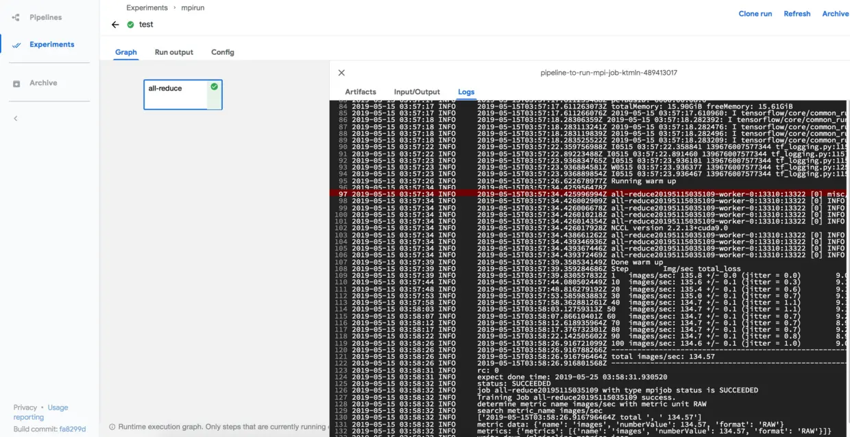 由于Kubeflow Pipelines提供的例子多数都是单机任务,那么如何利用Pipelines运行分布式训练?阿里云容器服务团队提供了利用MPIJob训练ResNet101模型的例子,方便您在阿里云上使用和学习Kubeflow Pipelines,并且训练支持分布式的allreduce模型训练。