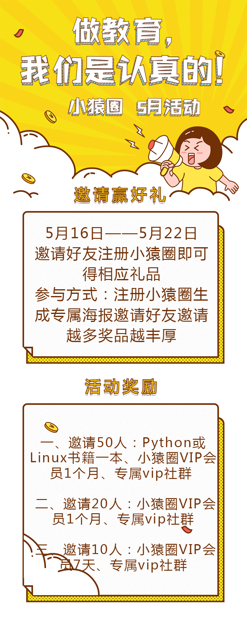 小猿圈5月活动篇——邀请赢好礼 小猿圈002 2019-05-17 220 阅读1分钟 活动截至:5月16日——5月22日活动规则:一、首先,需要你注册小猿圈网站二、点击邀请奖励,生成你专属的二维码三、分享给你的朋友、空间、朋友圈。四、通过短信或者个人中心查看邀请人数,达到活动要求即可领取奖品。