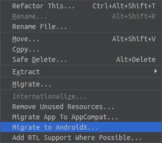 Android Studio 3.2.0 Canary 14及以上版本提供了方便快捷的一键迁移到 AndroidX 的功能。在菜单上选择 Refactor->Migrate to AndroidX 即可完成迁移。