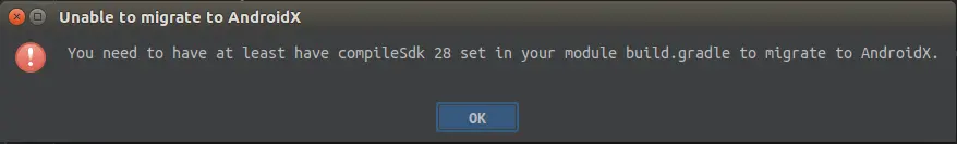 如果准备工作第三点中你的 compileSdkVersion 没有升到28及以上点击 “Migrate to AndroidX” 会提示: