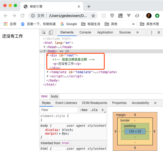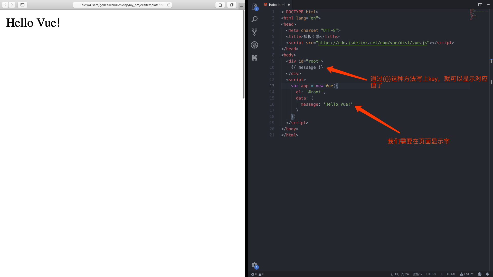 上面我们我们可以看出来,我们只是在标签中写上了{{ message }},但是渲染粗来的,确实对应的下面声明的data中的message的值,当然,vue在中间做了很多事情,还有diff算法之类的,但是我们今天不涉及diff算法的东西,只是了解一下前端中的模板引擎
