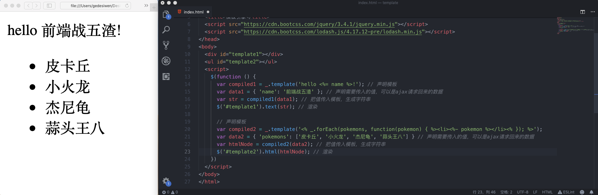 lodash中的模板看起来跟vue的不太一样是不是,他用的<%= %>这种东西来包住变量名,所以我一开始说了不局限于{{ }}这种花括号