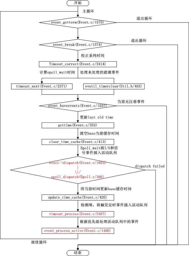 支持Libevent运转的就是一个大循环,这个主循环体现在event_base_loop(Event.c/1533)函数里,该函数的执行流程如下: