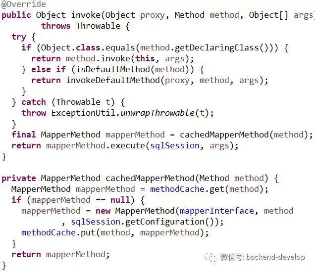 在 MapperProxy 中,实现了 InvocationHandler 的 invoke 方法。methodCache 是一个 ConcurrentHashMap,其中存储了方法与 MapperMethod 的对应关系。从 methodCache 缓存中获取或创建 MapperMethod 对象,然后调用 MapperMethod 对象的 execute 方法执行数据库操作。