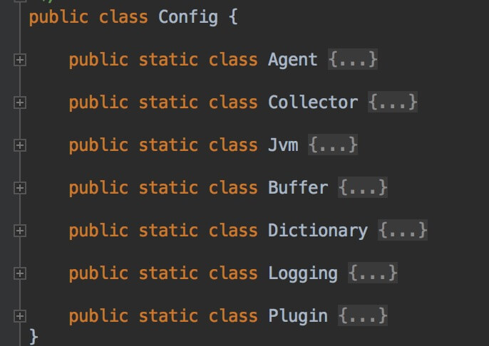 打开 Config ,我们会看到拆分了 Agent / Collector / Jvm / Buffer / Dictionary / Logging / Plugin 七个小类。如下图 :
