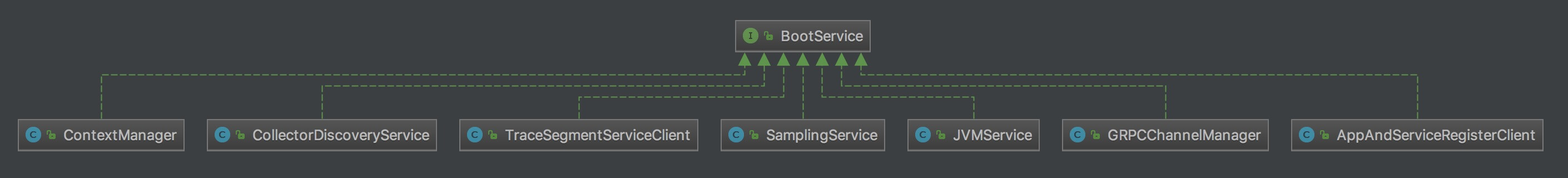 org.skywalking.apm.agent.core.boot.BootService ,Agent 启动服务接口,定义了 #beforeBoot() / #boot() / #afterBoot() / #shutdown() 接口方法。