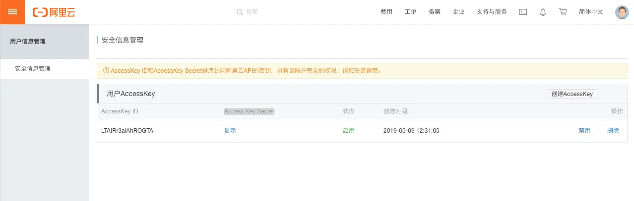 AccessKey是访问阿里云API的秘钥,这里也需要提前创建一份,创建后我们需要记住自己的AccessKey ID和Access Key Secret,如果忘记可以在如图位置查询。
