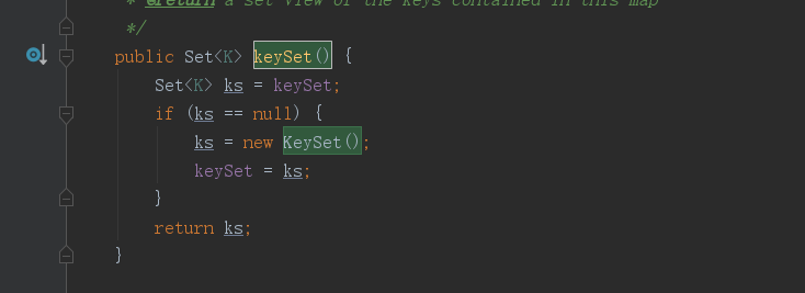 我们发现返回的其实是HashMap中的KeySet内部类我们再来看一下HashMap类中KeySet类: