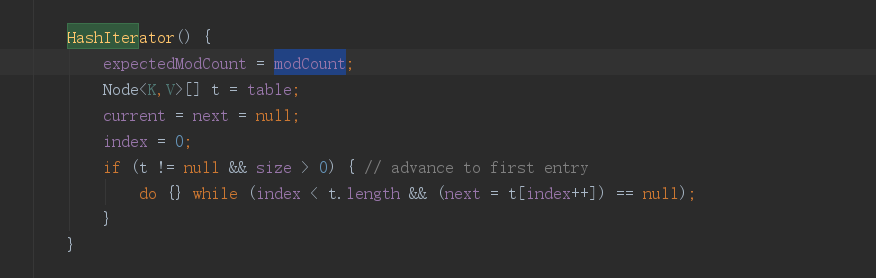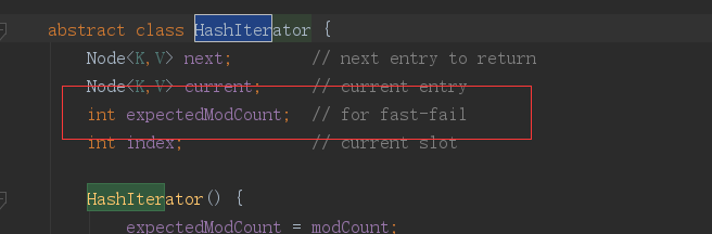 就是红圈圈住的expectedModCount 源码再次很贴心得告诉了我们这个字段用来做fast-fail,那具体这个字段是怎么用的呢? 我们来看HashIterator的构造函数: