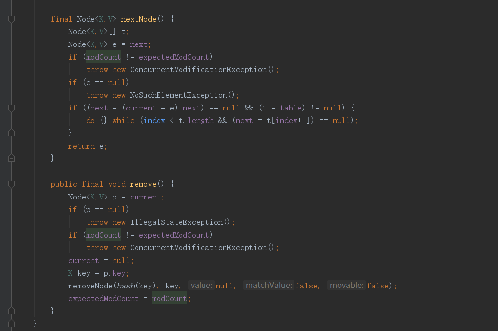 我们发现在Iterator生成的时候这个expectedModCount被赋上了modCount的值。好了,铺垫了这么多,我们终于可以说到重点,那就是fail-fast机制到底是如何实现的,我们把关注点放在HashIterator类中的nextNode()以及remove方法上: