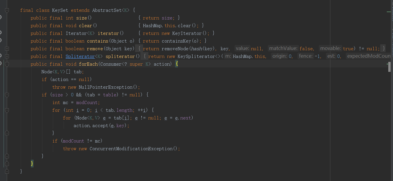 发现啥没?没错,其实所有的KeySet的操作都是调用HashMap的方法来完成的,这就是为什么对返回的KeySet中的操作会反映到HashMap以及对HashMap进行操作也会反映到KeySet的原因。在我个人认为这也是fail-fast机制出现的根本原因。