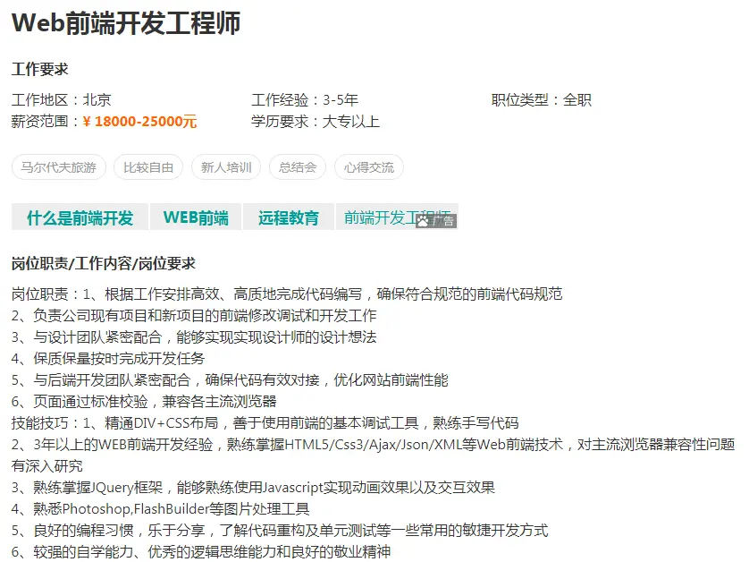 一个图形界面转换网页的APP的发布就人那么多人出现恐慌,只能说明一点,就是很多人对前端开发的认识还不够清晰,不够明确。 真正的前端开发不是机械的傻瓜式网站生成就能替代的,在这个前端开发飞速发展的互联网时代,如果你还认为前端开发还是以前的切图切网页的,那你就大错特错了。 从下面这条招聘信息就可以看到企业对现在前端开发技术人员的要求: