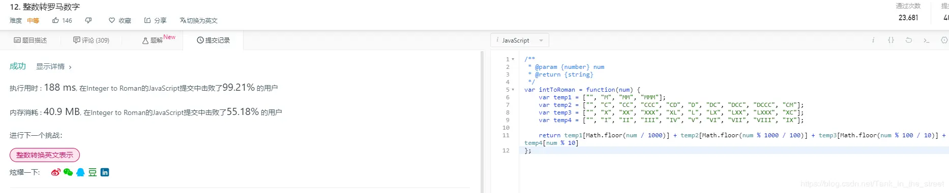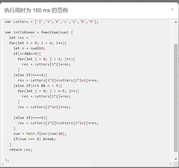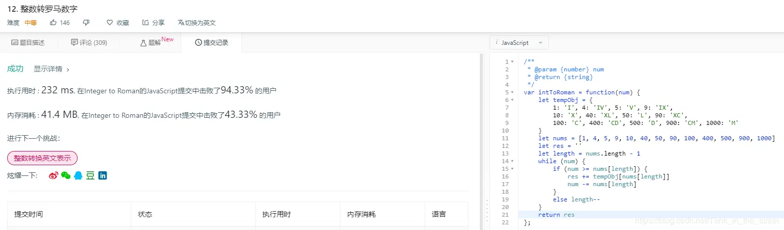 换了新方法后在空间的上的速度快了不少,主要是少用了一个正则表达式。说完罗马数转整数,下面难度进阶一点,讲整数转罗马数。既然已经知道了第二种的解法,其实可以利用第二种解发稍微变通一下就变成了第十二题的解法。我们可以把对象里的罗马字符属性名换成整数为属性名,属性值为罗马字符串。然后用一个数组储存对象里的属性名,随后利用双指针对数组进行遍历,如果传过来的参数值大于数组最后一位数,则把当前下标对应的罗马数拼接到一个字符串遍历上,然后传过来的参数减掉比较的数,直到传过来的参数的值小于1为止。代码如下所示: