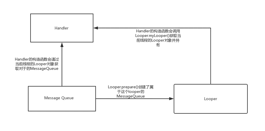 - Handler类,Handler类内部会持有一个MessageQueue对象和一个Looper的实例,这两个实例都是和线程相关的,在调用Handler构造函数并且没传入Looper参数的情况下,默认就是当前线程的Looper和MessageQueue