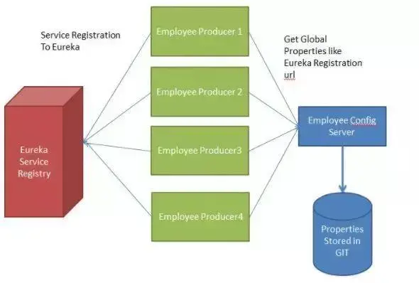 下面的例子中多个员工生产者模块从Employee Config Module获取Eureka注册的财产。