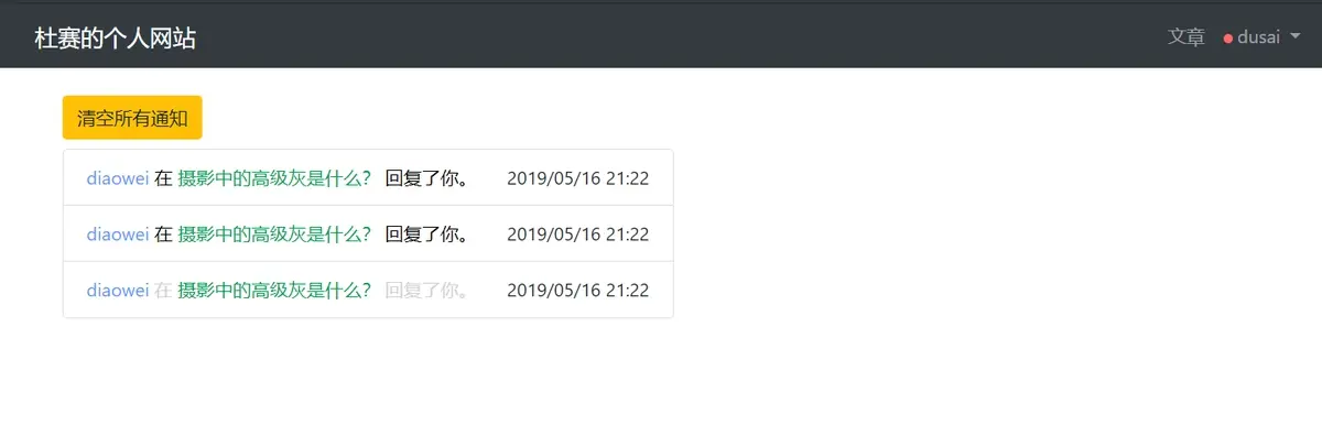 打开服务器,用一个普通账号评论几条,再登录管理员账号并进入通知页面: