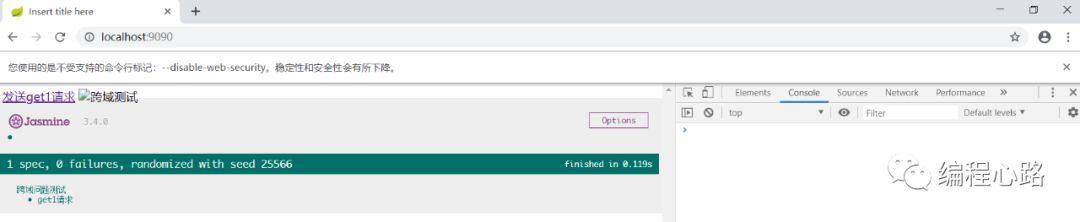 浏览器默认都是开启跨域安全检查的,我们可以使用命令行启动浏览器,加上禁止安全检查的参数,以谷歌浏览器为例,chrome.exe --disable-web-security --user-data-dir=E:/temp --user-data-dir 为浏览器缓存临时目录,浏览器这时会提示安全问题。