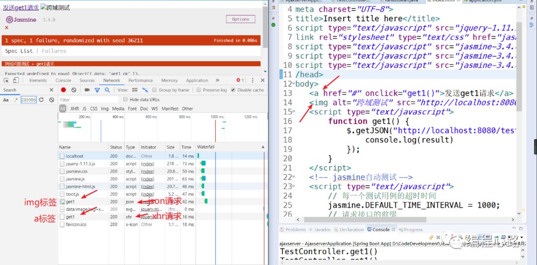 • 3、发送的是XHR(XMLHttpRequest)请求,可以使用 a 标签(模拟xhr请求)和 img 标签(模拟json请求)做对比(控制台只报了一个跨域异常)