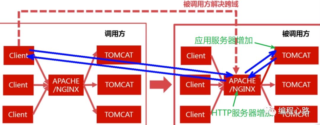 调用方的解决思路是反向代理,也即是将被调用方的域名代理到调用方域名下,这样就符合同源策略了,也就解决了跨域问题。