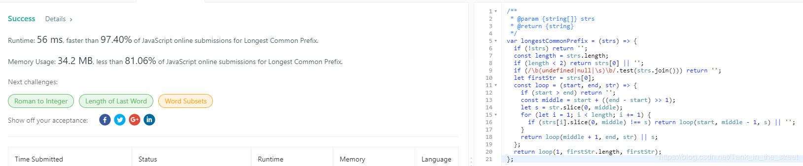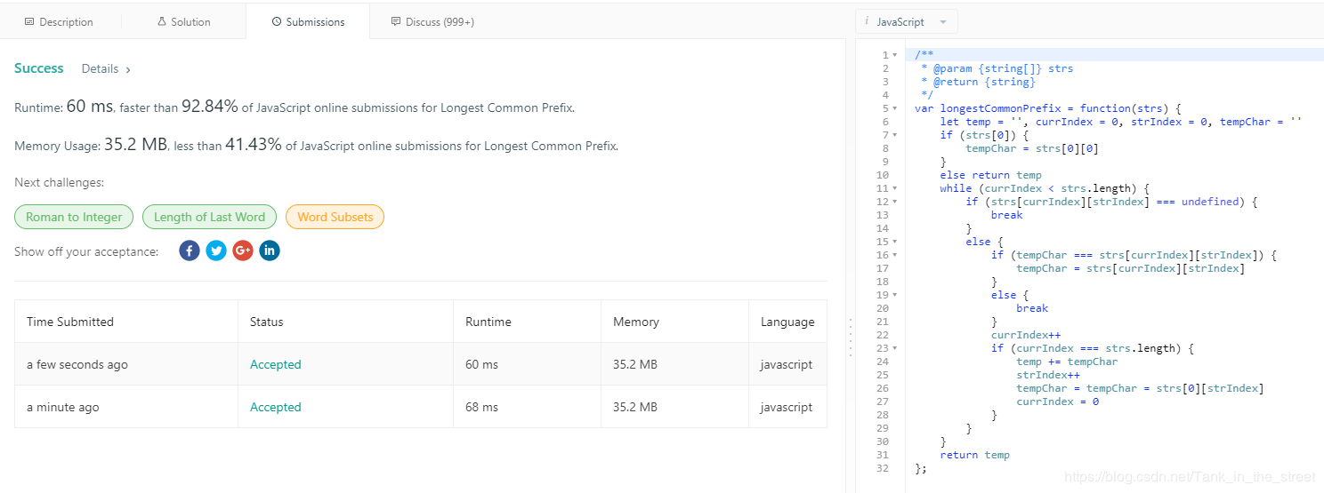 本题有个地方要注意的是空字符也是一个字符串,要判断当前数组中有无空字符串,有的话则直接返回。说实话,好像中文版的运行时间好像普遍比国际版的运行时间慢,不知道什么原因。