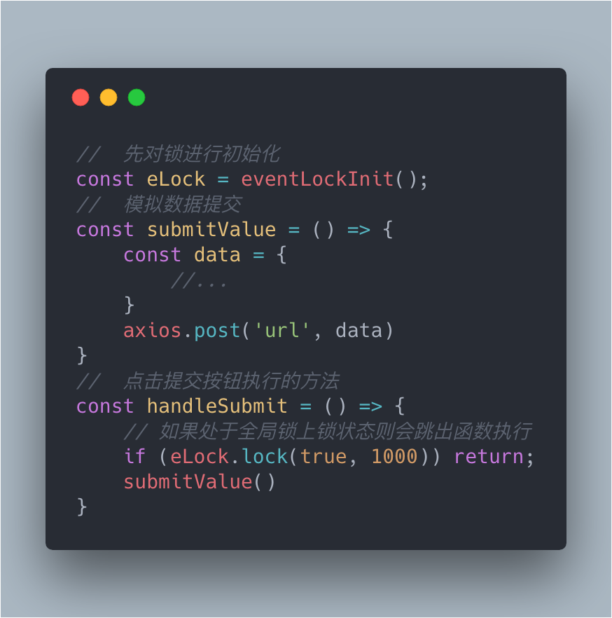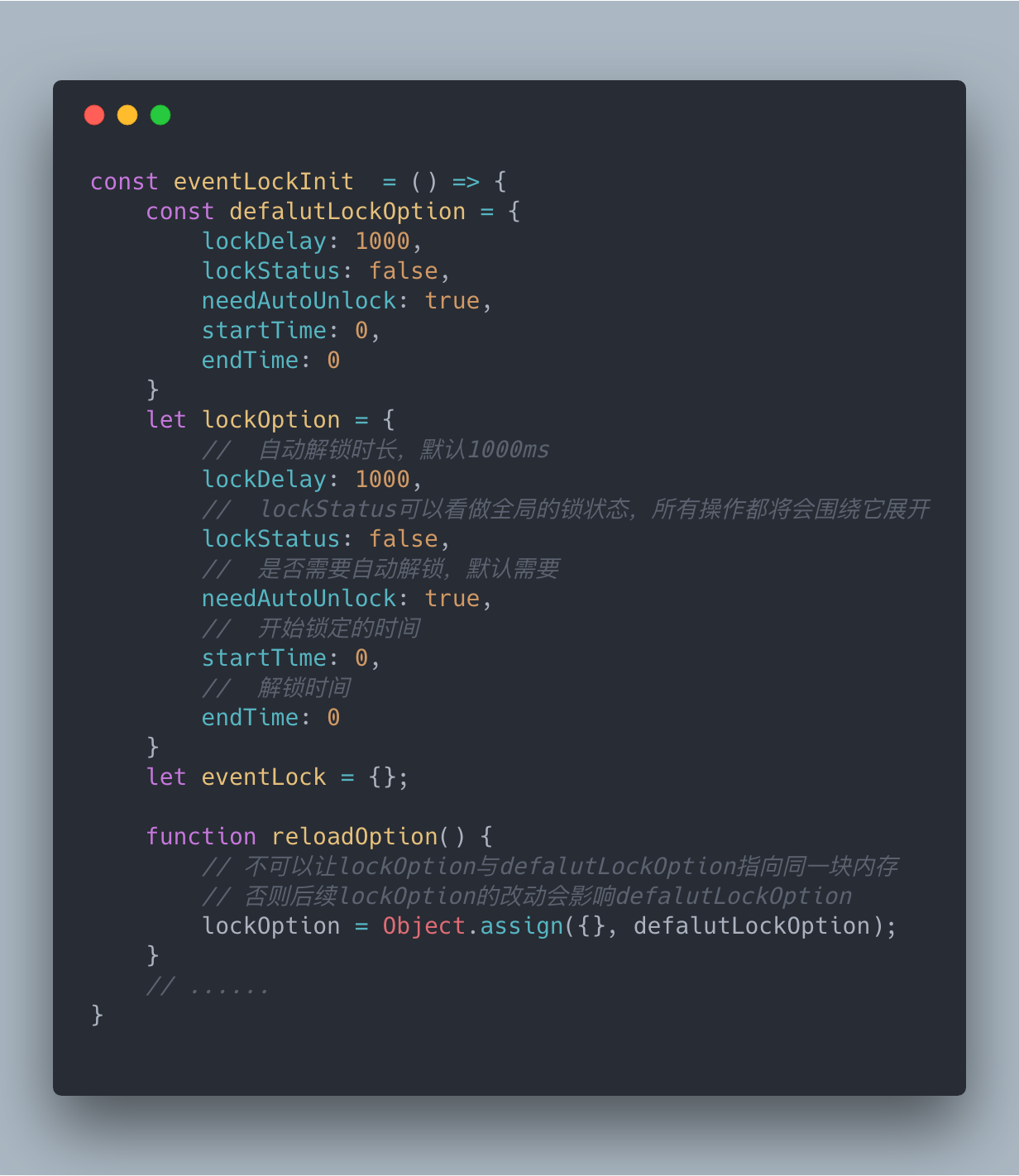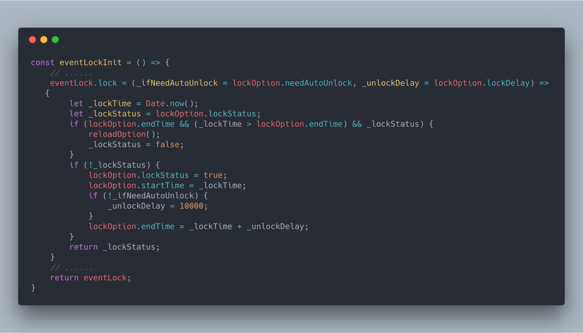 上面是全局锁最核心的功能,当然就是“上锁”这个操作啦。它接受两个参数--是否自动释放锁、自动释放锁的时间。但是大家会发现,在设定释放时间的时候我还是写了10000ms,这样做是为了避免某些没能手动取消锁导致的页面无法点击情况。
