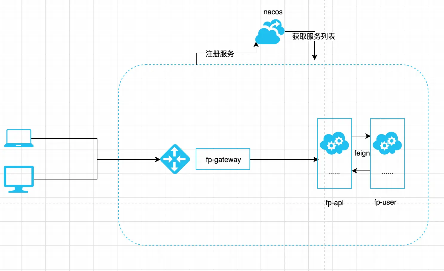 nacos阿里开源的服务发现fp-gateway网关服务fp-apiapi服务fp-user用户服务