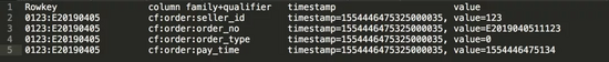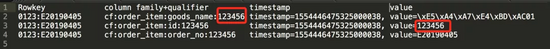 针对订单商品表,我们写入的数据同样以订单号生成相应的 rowkey,同时定义单 column family,qualifiy 格式为 表: 字段: 对应记录的 id 值 value 为对应的 value 值,timestamp 为 SeqNo,如图所示: