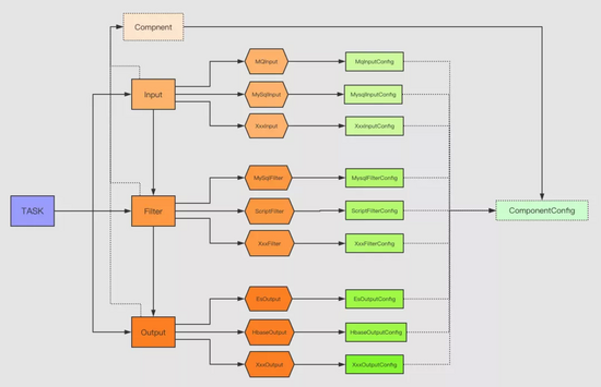 上文已经讲到数据同步是由一个数据源(这个数据源可以来自于 MQ、Mysql 等)同步到另外一个数据源(Mysql、ES、HBase、Alert 等),也就是一个管道的过程。借鉴了一下 logstash 官网,同样处理流程分为 input、filter、output 组件,这些流程称之为 task 任务,如图所示: