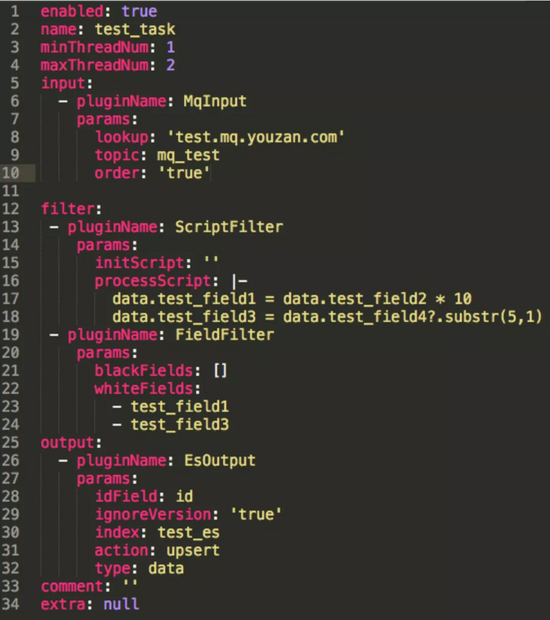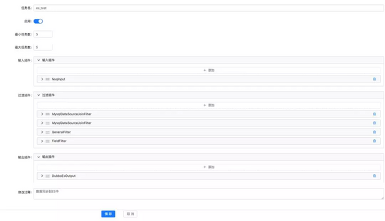 通过一系列的配置,就能配置出一个任务,针对业务逻辑,可以采用动态语言 groovy 来实行脚本化处理(复杂业务场景可以通过 UDF 函数来做支持),针对 mqinput 拿到的字段然后经过处理,经过过滤 filter 等,可以直接拿到相关的数据进行组装,然后配置化的写入到 ES 中,无需开发任何一行 java 代码即可实现流程自动配置化,针对复杂的需求也能够高效率支持。配置界面如图所示: