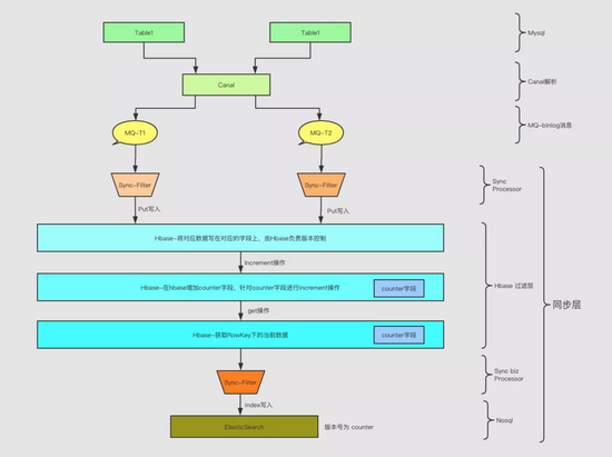 Hbase 同步相对来说比较简单,Hbase 内部拥有 timestamp 协助控制每个 qualify 的版本,只要让 timestamp 传入上文所说的顺序 SeqNo,那么就可以保证每个字段读取出来的数据是最终一致性的。