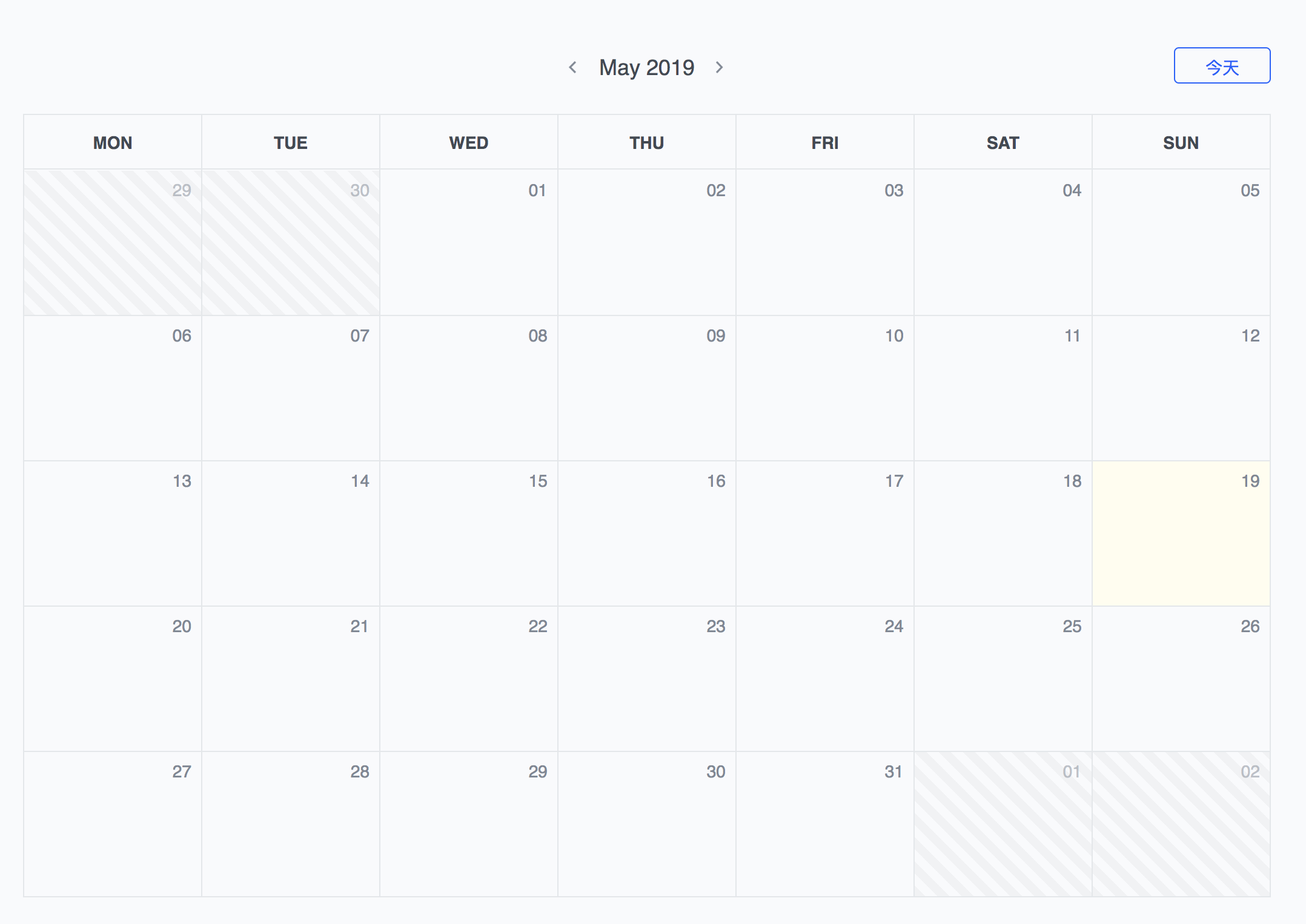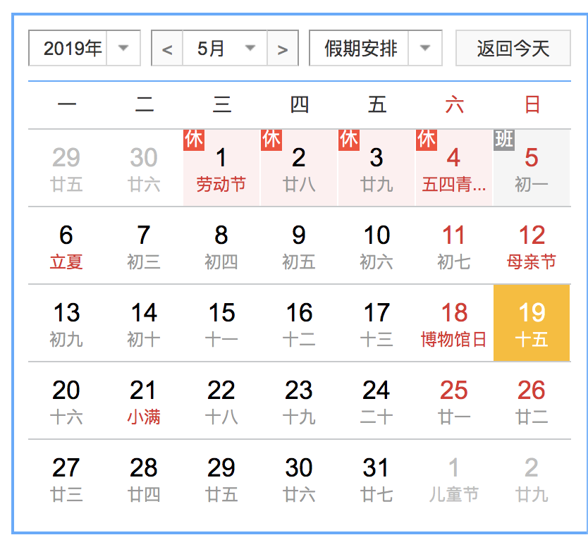 然后给类名加一些自己喜欢的样式就可以愉快的区分出当前月和上下月以及今天