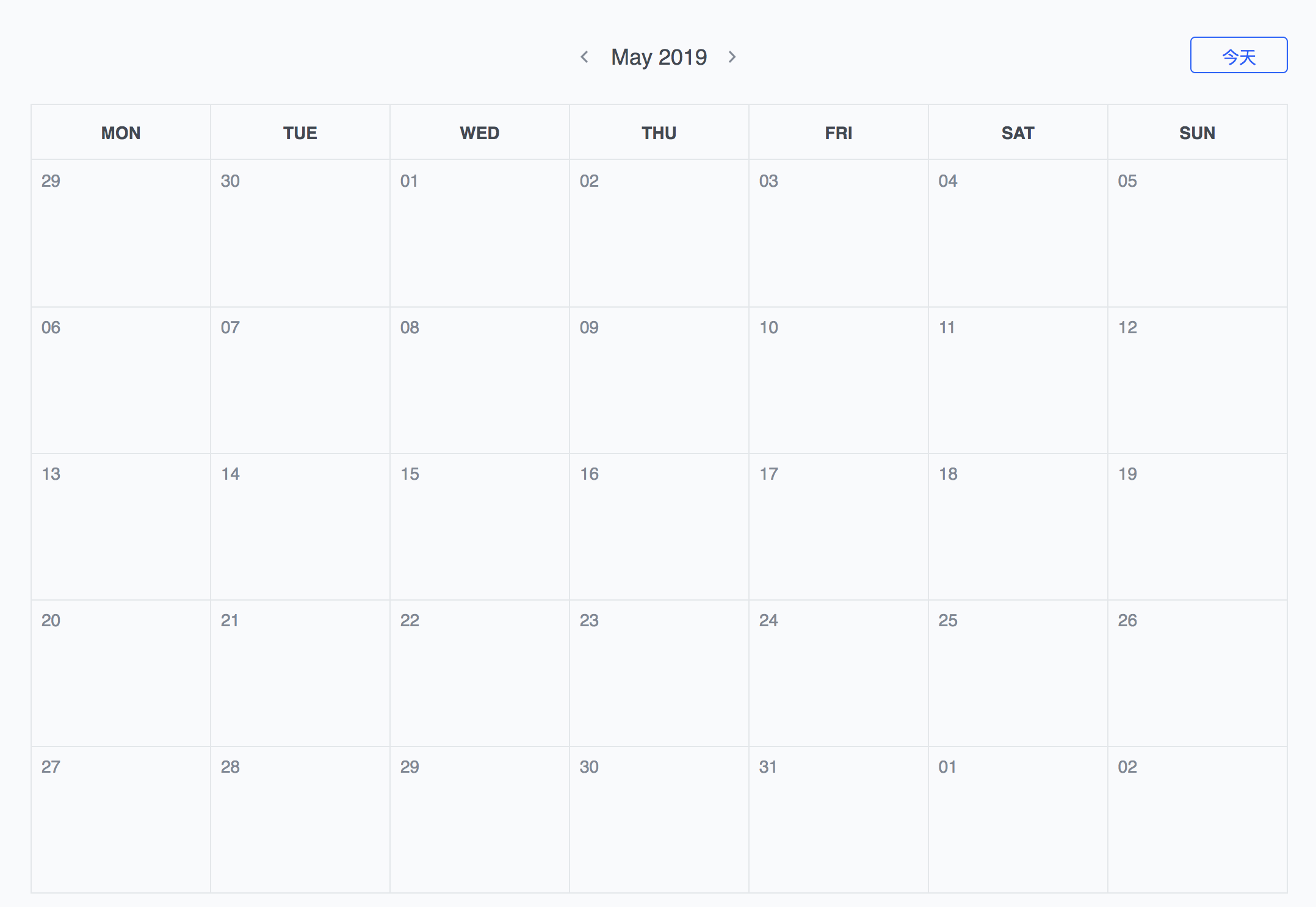 但是这样很丑,而且不能区分出哪一天是上个月哪一天是下个月,所以我们需要给上下月去加一下样式来区分当前月和上下月的区分