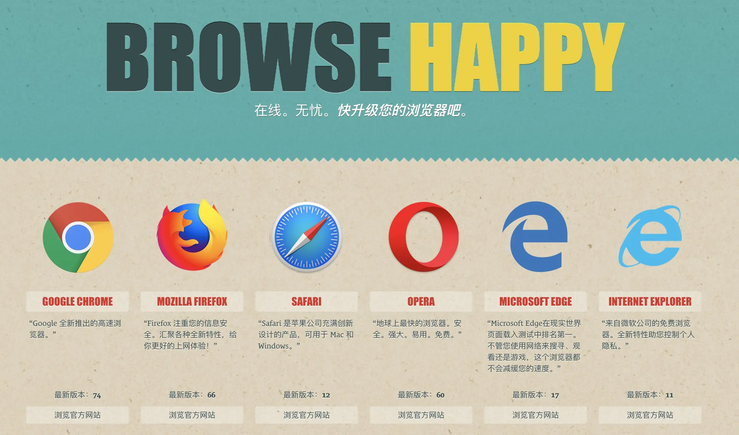 - browsehappy 当客户浏览器版本太低需要提示下载高版本浏览器的时候