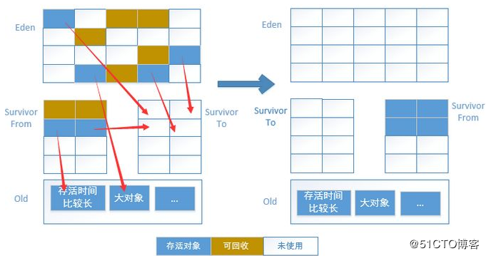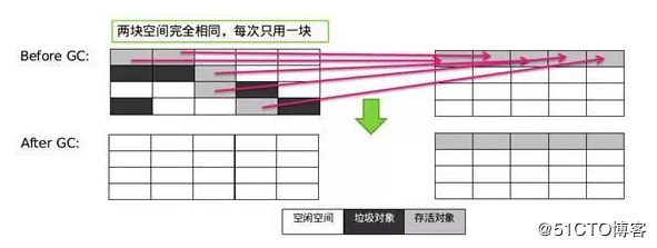 3.复制算法:把内存空间划为两个相等的区域,每次只使用其中一个区域。gc时遍历当前使用区域,把正在使用中的对象复制到另外一个区域中。算法每次只处理正在使用中的对象,因此复制成本比较小,同时复制过去以后还能进行相应的内存整理,不会出现“碎片”问题。不足之处:1.内存利用率问题2.在对象存活率较高时,其效率会变低。