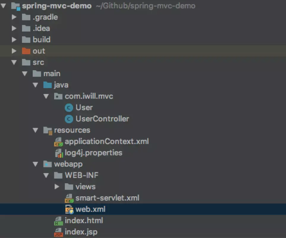 我们运行一个小样例来了解Spring MVC处理流程,项目结构如下: