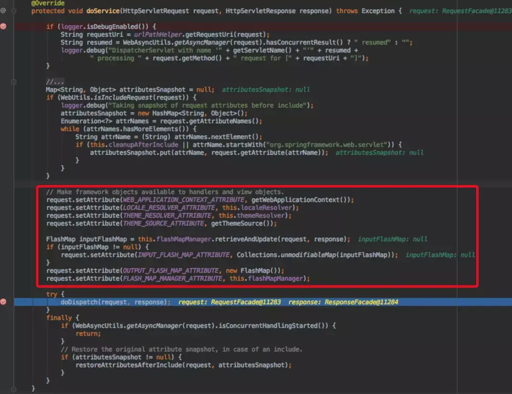 接下来的主要处理逻辑在org.springframework.web.servlet.DispatcherServlet#doDispatch中: