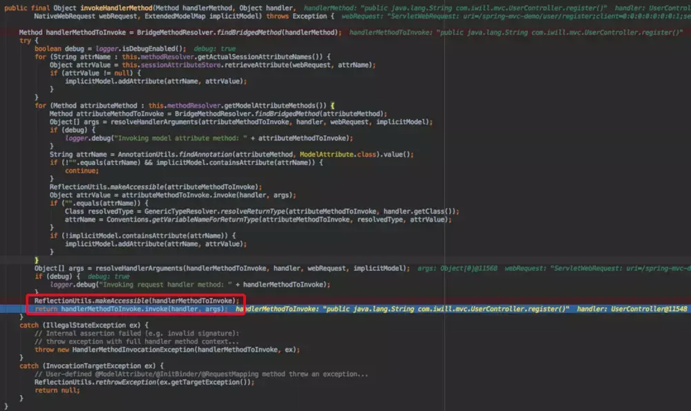 红框中,通过反射调用UserController的register方法。这样请求就被传递到了实际的controller方法了。