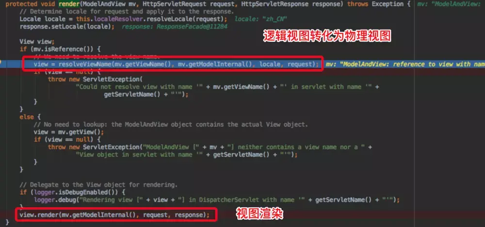 //逻辑视图名转换为物理视图名,并进行视图渲染